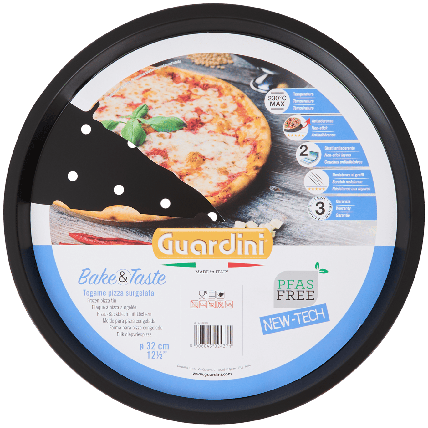 Hornea las pizzas más crujientes con esta bandeja para pizza Guardini. El diseño perforado hace que la base quede crujiente, mientras que la capa antiadherente hace que la pizza se deslice fácilmente de la bandeja.
