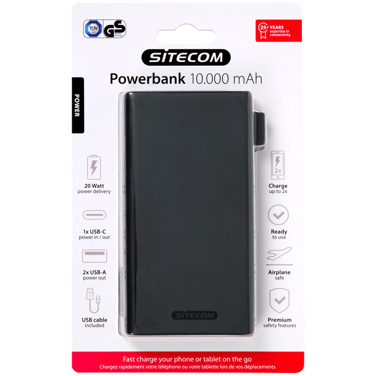 Cette batterie externe Sitecom est votre nouvelle amie ! La batterie externe recharge votre téléphone jusqu’à 2 fois et convient également à l’avion, donc parfaite à emporter en voyage. Elle est fournie avec un câble USB-C vers USB-A.