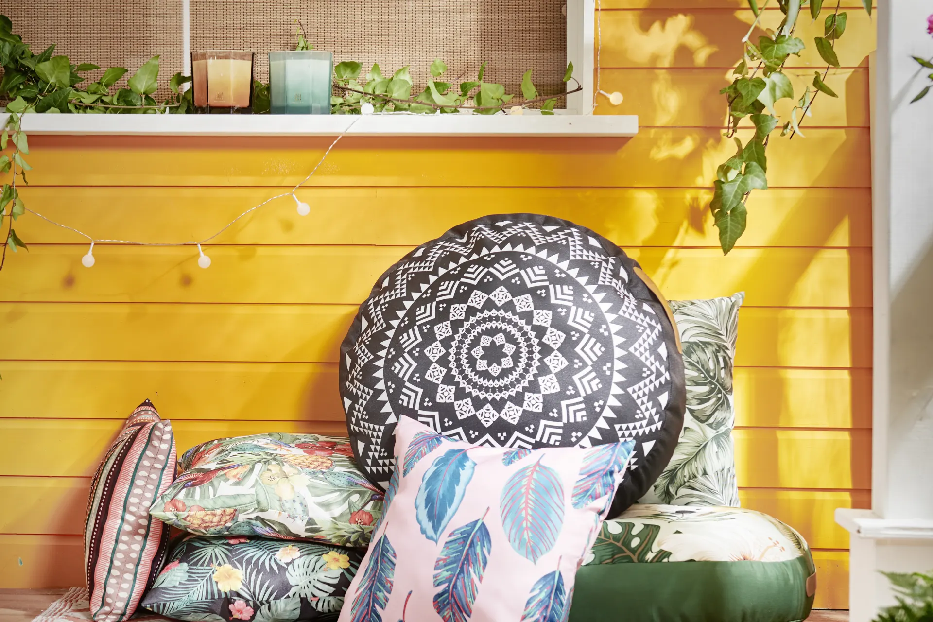 Laat je ogen vanzelf door de tuin leiden en voeg decoratie toe om meer niveau’s te creëeren. Zet bijvoorbeeld 1 pot op een plateau en een ander op een krukje. En natuurlijk mag een hangplant in een hippe macramé-hanger niet ontbreken. Dat trekt meteen de aandacht. Vergeet onze extra zachte kussens niet voor een zachte prijs. Houd het rustig en kies 1 kleur, maar kijk wel naar verschillende texturen. Denk aan linnen, velvet of een mooi patroon. Zo blijft het een geheel zonder dat het saai wordt. En hoe groter je tuinset, hoe meer je kunt variëren.